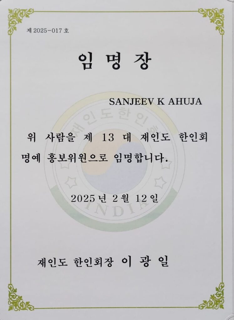 New Delhi, India—The Korean Association in India, the apex body of more than 5,000 Korean nationals working and living in Delhi and NCR towns, has appointed journalist-turned-media entrepreneur Sanjeev K Ahuja, Founder and editor-in-chief/CEO of Asian Community News Network (ACN Network), as Honorary Chair of the Public Relations Committee.