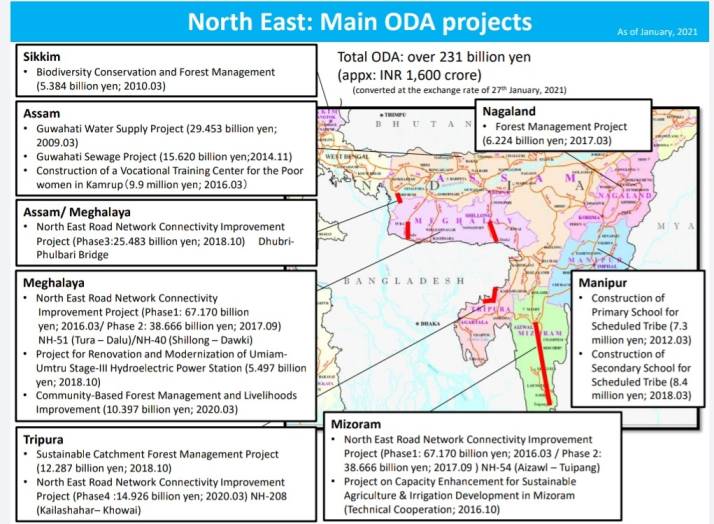Valued at 231 billion yen (appx INR 1,600 crore), the ongoing projects are being undertaken under the Official Development Assistant (ODA) from Japan government through the Japan International Cooperation Agency (JICA) in Sikkim, Meghalaya, Assam, Tripura, Mizoram, Nagaland, and Manipur.
