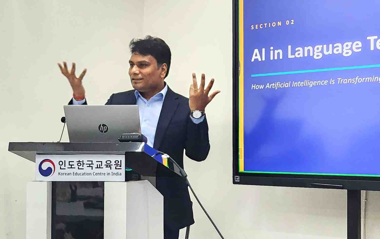 Under its Korean Language Teachers Training Program, the Korean Education Centre India held a special workshop on AI-integrated teaching, where JNU’s Dr. Satyanshu Srivastava demonstrated two classroom-ready apps for Korean language learners and trainee teachers.