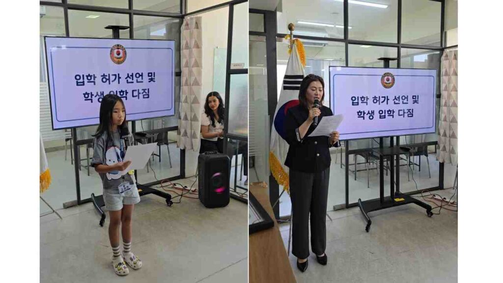 During the ceremony, Principal Ms.Yooseon Cheong pledged to provide safe and meaningful education through a detailed curriculum. Mr.Byunggi Ra, an advisor representing the Korean Association, also promised full support to create an optimal educational environment for the children. 이날 입학식에서 정유선 교장은 “헌신적으로 봉사해 주시는 선생님들과 함께 디테일한 커리큘럼을 바탕으로, 우리 아이들에게 안전하고 의미 있는 교육을 제공하겠다”고 다짐하셨습니다. 한인회 대표로 참석한 라병기 고문 역시 축사를 통해 “우리 아이들이 훌륭하게 성장할 수 있는 교육 환경을 조성하는 데 한인회가 전폭적인 지원을 아끼지 않겠다”고 약속하셨습니다.