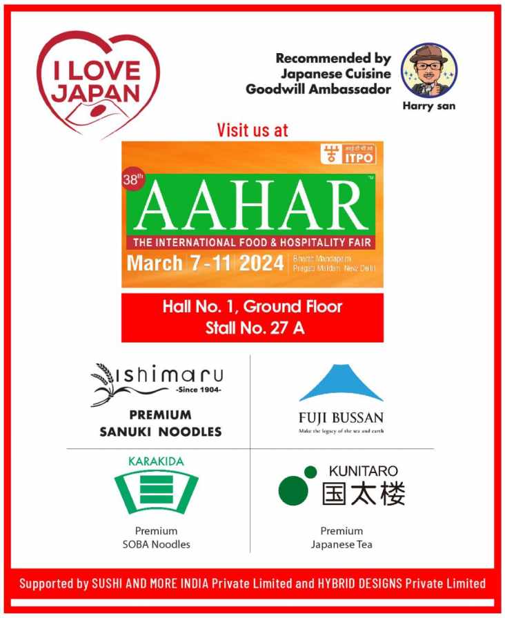 Singapore/Mumbai/Kobe: Japanese Cuisine Goodwill Ambassador Harry Hakuei Kosato accelerates the introduction and promotion of selected best “Made in Japan for India” products at AAHAR – India’s largest food & hospitality sector trade show organized by the Government of India in March 2024. The products being introduced are from 4 companies in Japan namely Ishimaru Sanuki Noodles, Karakida Shinshu Soba Noodles, Fuji Bussan Fuji Kabayaki Grilled Eel, and Kunitaro Japanese Green Tea Blended with Matcha.
