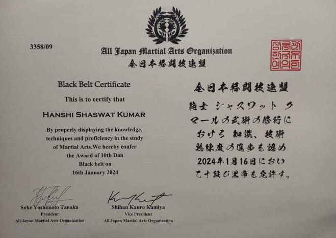 Hanshi Shaswat Kumar Becomes First Indian to Earn 10th Dan Black Belt from Japan