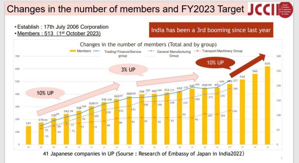 Q. It is for the first time that the Japan Chamber of Commerce and Industry in India (JCCII) has crossed the 500-membership mark. Please comment on this. Ans. We as Japan Chamber of Commerce and Industry in India (JCCII) always promote Indian business potential for Japanese companies. In India we have witnessed a business friendly approach by the government because of which the Japanese companies are more bullish about Indian market. The JCCII is the pivotal organization working for the welfare of Japanese companies in India. In India, JCCI started in 2006 with 147 Japanese companies as members and today we have grown to 513 (as on 1st October 2023) , and we are hopefully targeting to bring the membership to 620 Japanese companies in the year 2025, at the growth rate of 10 percent.