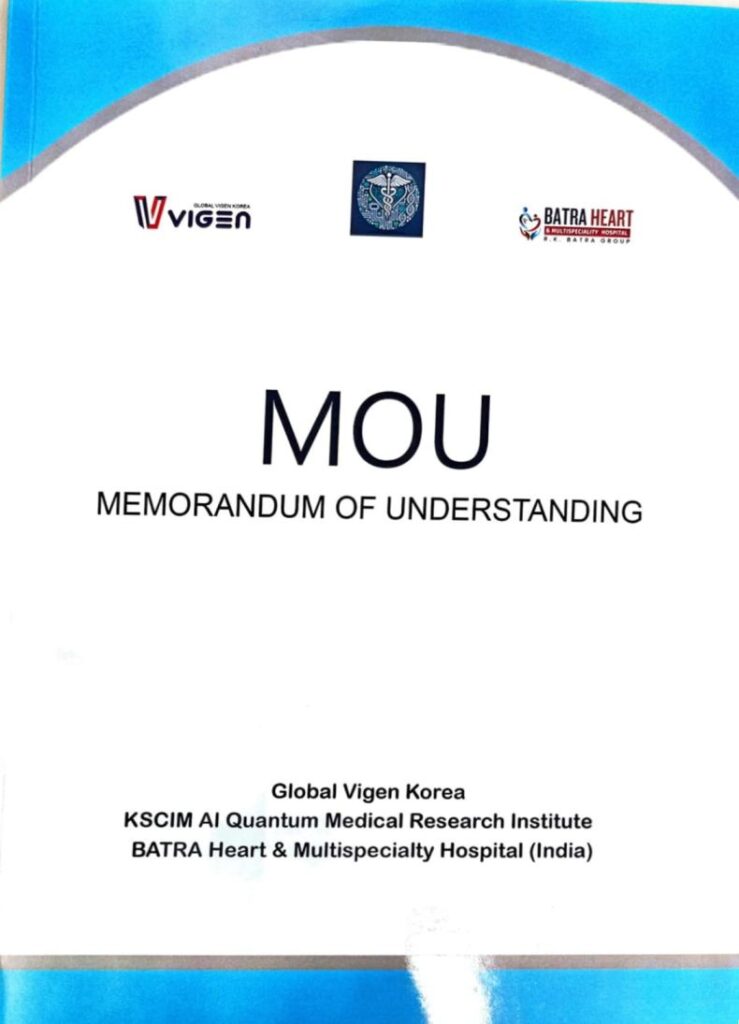 The forum culminated in signing a landmark memorandum of understanding (MOU) among India’s 120-bed Batra Heart & Multispeciality Hospital, Faidabad, Global VIGEN Korea, and the KSCIM AI Quantum Medical Research Institute. Dr. Punkaj Batra, CMD of Batra Heart & Multispecialty Hospital, was also present. This MOU paves the way for joint device development, clinical research, certification cooperation, market commercialization, and the establishment of an International AI Quantum Medical Society.