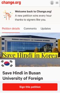 Kislay Kumar, who launched the online petition said, “While you sign the petition (http://chng.it/xXdm8L8v), I would urge you to kindly bear in mind that this not just a petition to reinstate Hindi in BUFS but this is a movement with a bigger goal to establish and strengthen the position and respect of India in Korea. I have also mentioned in the petition that it’s time, other Indian languages like Bengali, Tamil, etc. also be introduced in South Korean University. With increasing Korean investment in India, it is pertinent that the Korean Youths understand India better than they have been doing so far.”