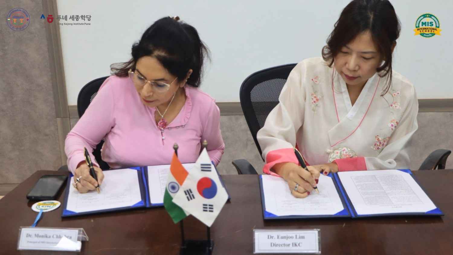 The signing ceremony was attended by Dr Eun-joo Lim, Director of the IKC Pune King Sejong Institute, Dr Monika Chhabra, Principal of MIS International School, and Sanjib Ghatak, Co-founder of the Indo-Korean Centre.