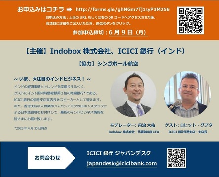 The keynote speaker, Mr. Rohit Gupta, Branch Manager of ICICI Bank’s Hong Kong office, will discuss the latest trends and business conditions across major Indian industries. Mr. Daisuke Tanji, CEO of Indobox Inc., will moderate the event and introduce Indobox’s initiatives supporting Japan-India business collaboration.