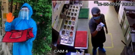 In the kitchen, the box is positioned inside the delivery hot bag which is then given to the rider. Delivery hot bags are disinfected after each order. And the TrustBrigade wears the PPE half on while on bike as it’s too hot otherwise.