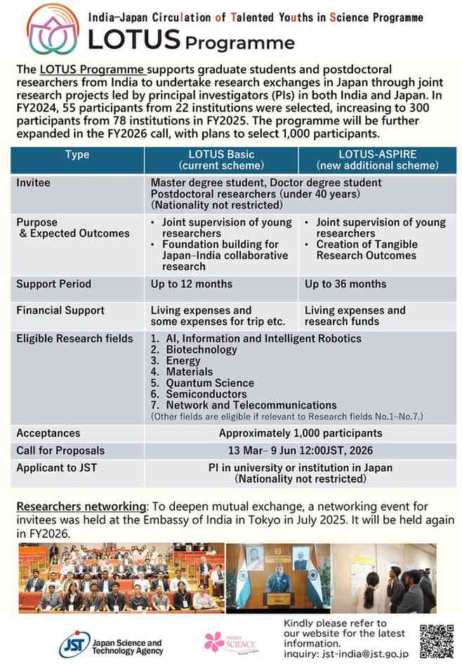 New Delhi: In a major push to deepen India-Japan scientific collaboration, Japan has invited around 1,000 participants under the LOTUS Programme 2026, a sharply expanded research exchange initiative for graduate students and postdoctoral researchers, with applications open till June 9, 2026. The programme is aimed at supporting Indian researchers to undertake joint research exchanges in Japan across cutting-edge fields, including AI, semiconductors, biotechnology, energy, and quantum science.