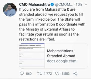 “If you are from Maharashtra & are stranded abroad, we request you to fill the form linked below. The State will pass this information & coordinate with the Ministry of External Affairs to facilitate your return as soon as the restrictions are lifted,” the CM said on his Twitter handle (https://twitter.com/CMOMaharashtra/status/1257571654164570114?s=20) on May 5.