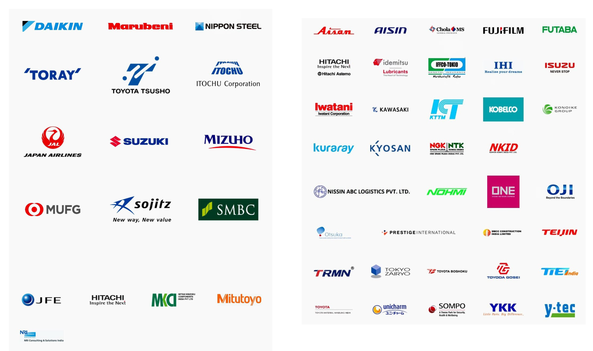 Apart from Mitsubishi Corporation, and Mitsui & Co, other Jaapnese companies supporting the event include  ITOCHU, Sumitomo, Marubeni, and Toyota Tsusho, other Japanese firms supporting this venture-based initiative include DAIKIN, NIPPON STEEL, TORAY, JAPAN AIRLINES, SUZUKI, MIZUHO, MUFG, Sojitz, HITACHI, SMBC, JFE, MKCI, Hitachi Estemo, Mitutoyo, NRI consulting, AISAN, AISIN, Chola MS, FUJIFILM, FUTABA, Idemitsu, IFFCO-TOKIO, ISUZU, IHI, Iwatani, KAWASAKI, ICT KTTM, COBELCO, KONIKE Group, Kuraray, Kyosan,  NGK/NTK, NKID, Nissin ABC, Nohmi, ONE, OJI, Otsuka, Prestigue International, SMCC Construction, TEJIN, TRMN, TOKYO ZAIRYO, TOYOTA BOSHOKU, TOYODA GOSEI, TIE India, Toyota Material Handling, Unicharm, SOMPO, YKK, and Y-tec.