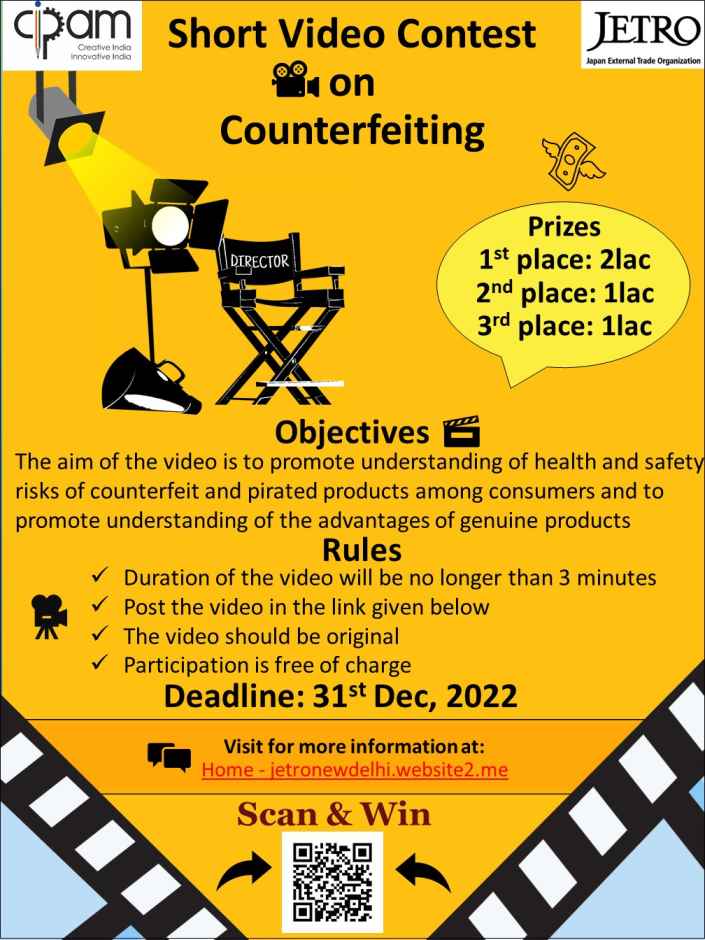 NEW DELHI: As part of its initiative to raise awareness about the health and safety risks associated with counterfeit and pirated products, as well as to promote a better understanding of the advantages of genuine products, the Japan External Trade Organization (JETRO) in collaboration with Cell for IPR Promotion and Management (CIPAM) has announced a short-video contest.