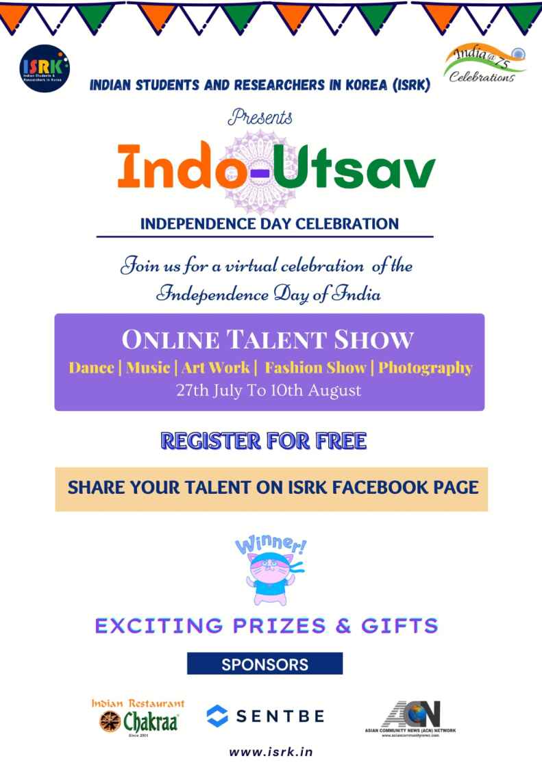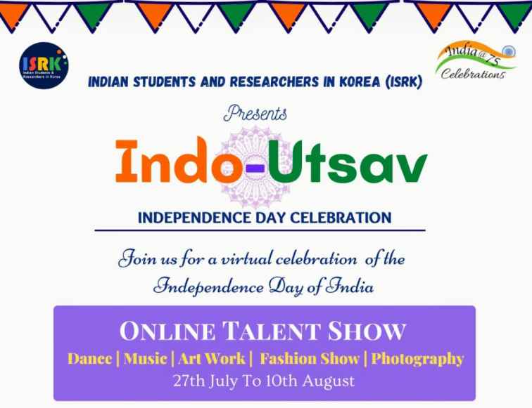 As India is all set to celebrate its 75th Independence Day on August 15, 2021, with full joy and enthusiasm, on this occasion Indian Students and Researchers in Korea (ISRK) presents “Indo-Utsav” to celebrate the colors of independence. We cordially invite all Indians in Korea to join the Indo-Utsav celebration. Since it’s a very happy coincidence that India shares its Independence Day, August 15 with Korea, ISRK aims to celebrate together with the people of Korea.