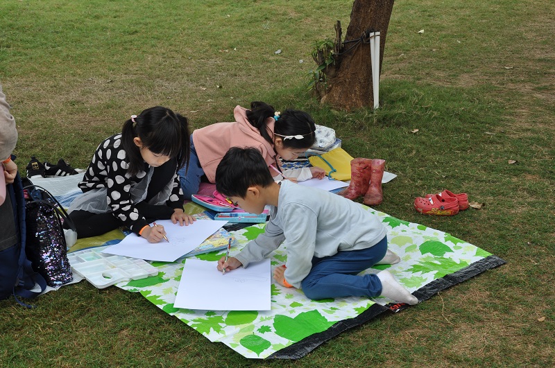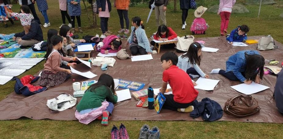 The children drew landscapes, rivers, trees, rivers, mountains and butterflies using diverse colours to mark the moment.