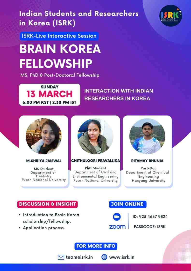 SEOUL: As part of ongoing series of ISRK Live Interactive Sessions on higher studies and research opportunities in Korea, Indian Students and Researchers in Korea – ISRK is conducting Third Live Interactive Session on Brain Korea Fellowship for MS, Ph.D., and Post-Doc research in Korea on 13th March 2022 at 6:00 pm KST / 2:30 pm IST.