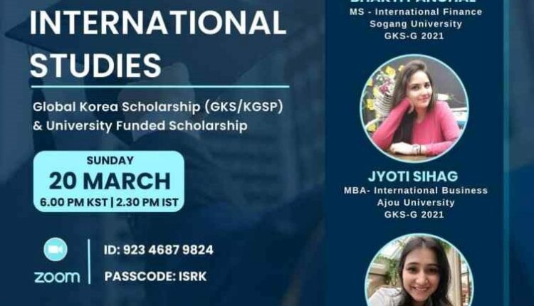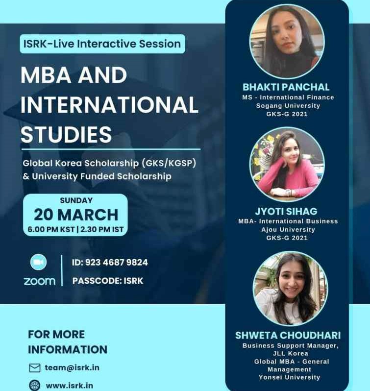 To clear all doubts regarding scholarship opportunities in Korea, Join us for a virtual interactive session on opportunities for MBA and International Studies in Korea on 20th March 2022 at 6:00 pm KST / 2:30 pm IST.