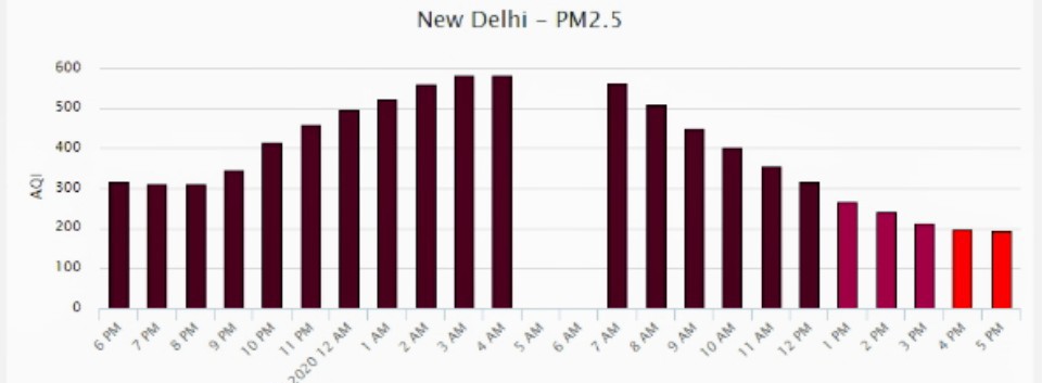 As per the AirNow records, the PM 2.5 level at 6 pm on Saturday was registered at 317, which shot up to 414 points at 10.00 pm, and finally touched 495 points at the midnight hours.