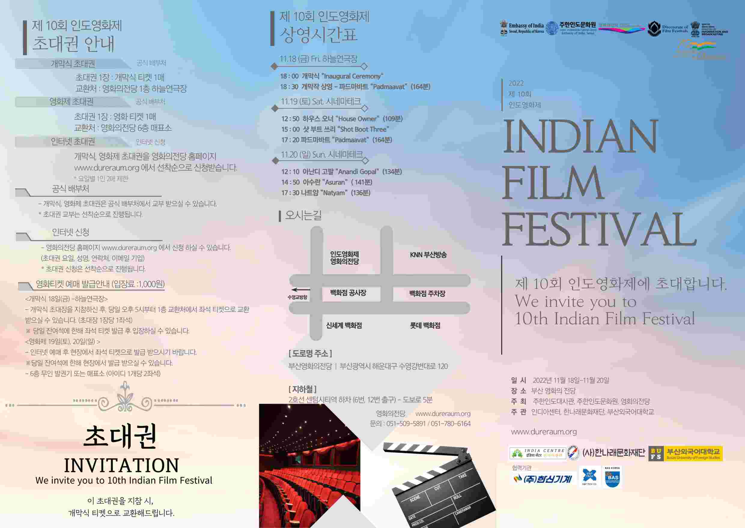 The Indian Film Festival in Busan is being organized in association with Busan Cinema Center, the India Centre at Busan University of Foreign Studies, and Hannarae Foundation for Culture, Hongbeop Temple, Busan. The festival has been supported by the Directorate of Film Festival, Ministry of Information and Broadcasting, Government of India.