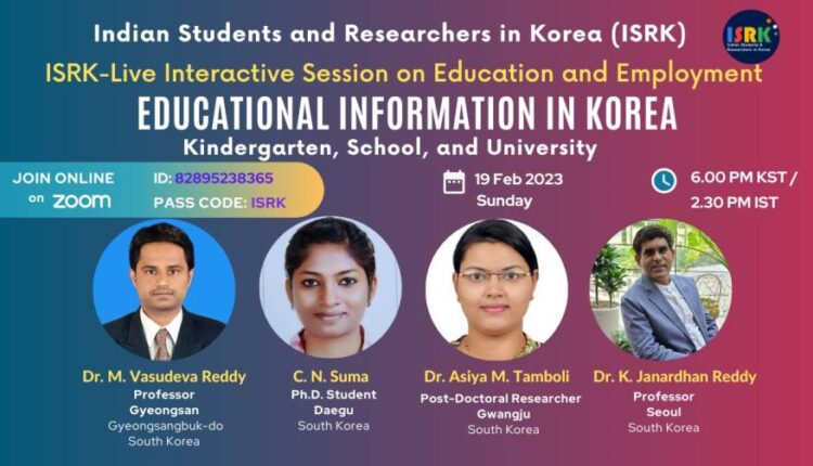 Being organizing on all Sundays for 3 months from February to April 2023, the ISRK live interactive sessions series will share various scholarship programs available in Korea to help aspiring Indian students, especially those coming from smaller towns. The ISRK is the association of over 3500 Indian researchers, scholars, and students based in Korea.