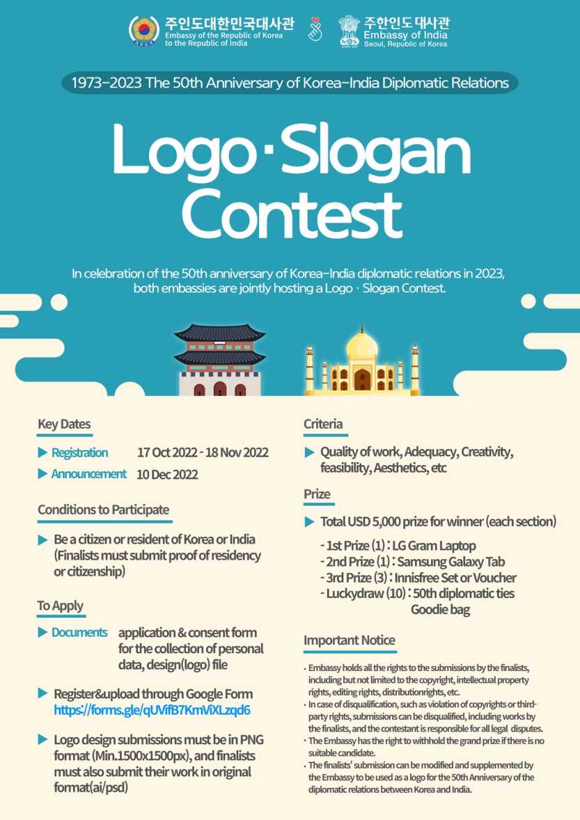 Embassy of the Republic of Korea to India and Embassy of India to Republic of Korea jointly announced a Logo·Slogan Contest effective October 17 –November 18, 2022. As an eligibility criteria,