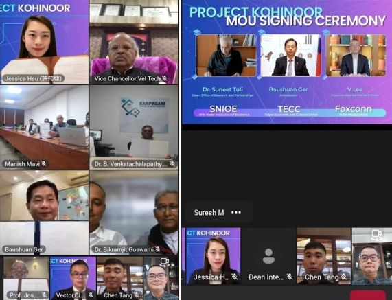 Mrs. Rangarajan Mahalakshmi Kishore, Chairperson of Managing Trustee, Vel Tech, Prof. S. Salivahanan, Vice Chancellor of Vel Tech, Fr. Dr Jose Palely, Vice Chancellor of Assam Don Bosco University, Prof. B Venkatachalapathi, Vice chancellor of Karpagam Academy of Higher Education, TN, Dr. Atul Mishra, Head – Department of International Relations and Governance Studies, Shiv Nadar University, and many faculty members participated in the virtual signing ceremony.