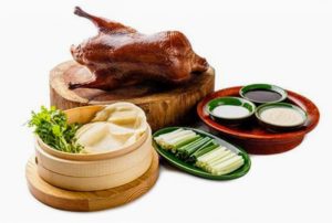 An elaborately prepared Chinese dish where the duck is coated with a honey mixture and hung until the skin is dry and hard. After that duck is roasted in a custom made oven, the skin becomes golden brown and intensely crisp. While hot, it’s carved into thin slices of skin and meat and served with thin pancakes accompanied by cucumber, scallion, and sweet bean sauce.