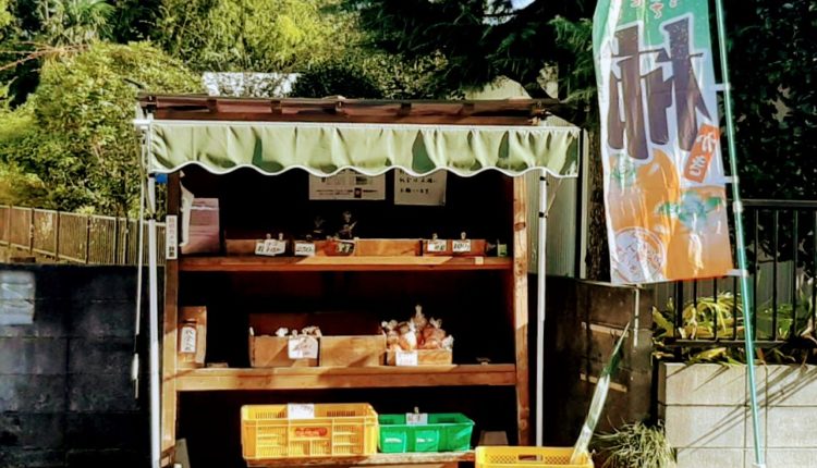 On display are fresh vegetables, fruits and nuts with their price tags, also a calculator, a small wooden money-box and carry bags. But what is missing at this shop in Kanagawa is the door and shopkeeper.